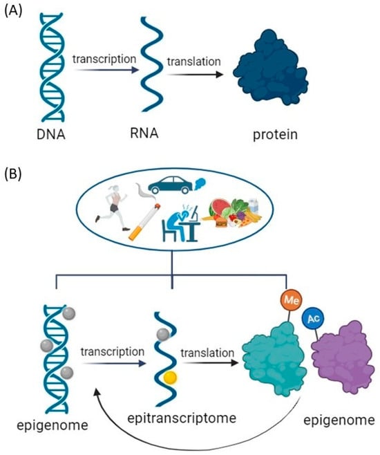 Modifications to the Central Dogma of Molecular Biology: Gene Regulation Modulation by Environmental Factors. (A) Central Dogma: a theory stating that genetic information flows only in one direction, from DNA to RNA to protein, or RNA directly to protein. (B) Environmental Modulation of Central Dogma: Impact on DNA Unfolding, Transcription, and Translation Processes. Epigenome modification = DNA methylation or acetylation and post-translational modifications of histone tails that include phosphorylation, ubiquitination, acetylation, and methylation. Epitranscriptome modifications = RNA modifications primary messenger RNA (mRNA) modifications: N1-methyladenosine (m1A), N6–methyladenosine (m6A), 5–methylcytosine (m5C), pseudouridine (Ψ), and others. Created with BioRender.com (accessed on 11 December 2023).