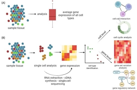 Genomics, transcriptomics, and epigenomics technologies focused on the characterization of individual cells from tissue samples. (A) Conventional massive population sequencing provides average expression signals for different cells, ignoring cell-to-cell variability. (B) By applying high-throughput droplet-based scRNA-seq to complex cell populations, it is possible to uncover different cell types and interactions between cells, follow the development of distinct cell lineages, track changes in gene expression, and identify regulatory relationships between genes. Created with BioRender.com (accessed on 11 December 2023).