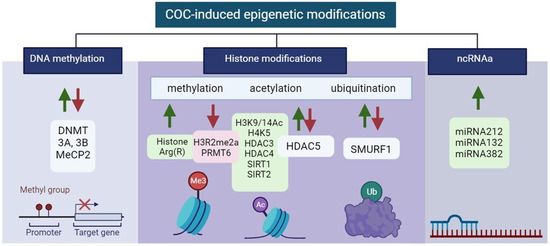 Illustration of aberrant alterations in COC-induced epigenetic modifications. Green and red arrows indicate upregulation and downregulation, respectively. Created with BioRender.com (accessed on 13 December 2023).
