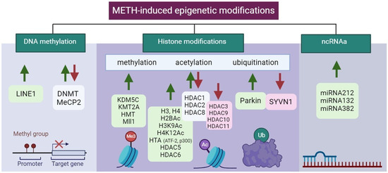 Illustration of aberrant alterations in METH-induced epigenetic modifications. Green and red arrows indicate upregulation and downregulation, respectively. Created with BioRender.com (accessed on 13 December 2023).