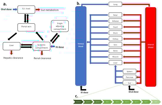 Pre-available lamotrigine and raltegravir non-pregnant population models were used as a starting point for model development, and the initial parameters had to be optimised before they could be applied to the gestating population. The decision to adapt from a “minimal PBPK” to a “full PBPK” model was based on the requirement to incorporate pregnancy population models in Simcyp, which necessitated the use of a full PBPK model. Additionally, the full PBPK model allowed for more comprehensive characterization of the disposition of the drug in the body, enabling a more accurate prediction of drug exposure in the target population. This is due to the difference in the level of complexity between the two models (Figure 1). Minimal PBPK models (Figure 1a) are best used in the early stages of model development, with the use of intravenous plasma profiles, as they treat the body as a single systemic compartment. To fully appreciate the interplay of different organs involved after oral administration of a drug, full PBPK models should be developed, as they incorporate in their mathematical structure several distinct compartments (Figure 1b). For the pregnancy population model, the use of the full PBPK model is needed, regardless of the drug administration route, to account for the impact of pregnancy-related physiological changes on tissues and organs. Moreover, an additional foetal-placental compartment is added to the full PBPK structure. The adaptation of previously available minimal PBPK parameters to full PBPK was therefore considered necessary to improve the reliability of the model in evaluating drug pharmacokinetics during pregnancy.