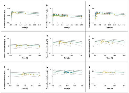 Lamotrigine healthy adult volunteer population plasma concentration profiles. Green lines represent the predicted mean and grey the 5th and 95th percentiles. The overlayed mean observed data points were extracted from clinical studies including various dosing regimens: (a) 25 mg SD []; (b) 100 mg SD yellow [] blue [] green [] red []; (c) 200 mg SD yellow [] blue [] green [] red []; (d) 50 mg QD []; (e) 150 mg QD []; (f) 200 mg QD [] (g) 50 mg BID [] (h) 100 mg BID yellow [] blue []; (i) 150 mg BID [].