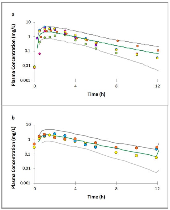 Plasma concentration profiles of raltegravir. Green lines represent the predicted mean and grey the 5th and 95th percentiles. The overlayed mean observed data points were extracted from clinical studies, including various dosing regimens. (a) The 400 mg SD adult population: yellow [], blue [], red [], green [], purple [] and pink [], respectively; (b) the 400 mg QD adult population: yellow [], blue [] and red [], respectively.