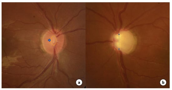 (a) The optic nerve head with healthy neuroretinal rim, area surrounding the inside dotted circle. There inside dotted circle, marked with blue arrow is cup. (b) The optic nerve in glaucomatous eye. Note the loss of NRR and increase in cup size, marked with blue line.