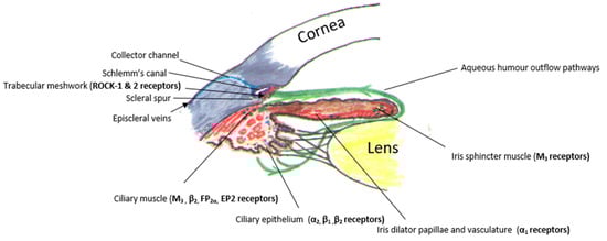 Schematic diagram of structures of the anterior chamber of the eye to illustrate site of action and receptors of the IOP-lowering drugs.