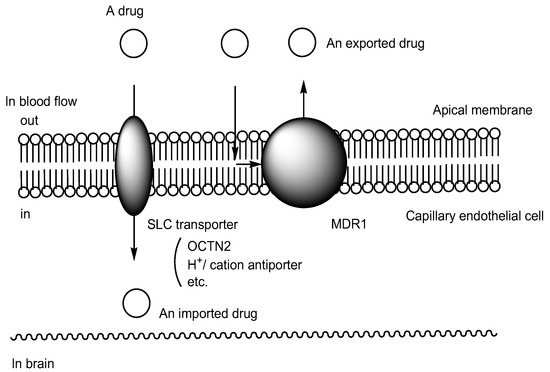 - Tashima, T. Carrier-Mediated Delivery of Low-Molecular-Weight N-Containing Drugs across the Blood–Brain Barrier or the Blood–Retinal Barrier Using the Proton-Coupled Organic Cation Antiporter. Future Pharmacol. 2023, 3, 742–762. [Google Scholar] [CrossRef]