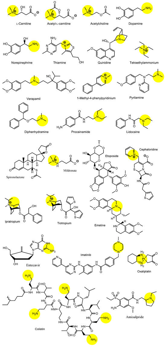 - Ekins, S.; Diao, L.; Polli, J.E. A Substrate Pharmacophore for the Human Organic Cation/Carnitine Transporter Identi-fies Compounds Associated with Rhabdomyolysis. Mol. Pharm. 2012, 9, 905–913. [Google Scholar] [CrossRef]