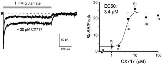 Effects of CX717 on AMPA receptor-mediated currents in excised patches from hippocampal pyramidal cells in field CA1. (Left): Representative traces in the presence and absence of CX717. The horizontal bar indicates the application of 1 mM glutamate. Moreover, 30 μM CX717 was included in both the background and glutamate-containing solution. Holding potential: −50 mV. (Right): Concentration response relations. %SS/Peak denotes the percentage of steady-state current relative to the peak amplitude. Numbers in parentheses indicate the number of experiments. p < 0.001, F (6, 24) = 23.7, one-way ANOVA.