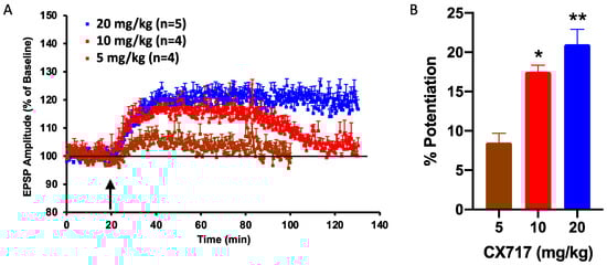 After determining the effects of CX717 in vitro, we tested the ability of CX717 to potentiate synaptic responses in vivo in anesthetized animals following IP administration. CX717 produced a long-lasting increase in the evoked EPSPs in a dose-dependent manner when dosed IP at 5, 10, or 20 mg/kg. CX717 increased the amplitude of the evoked EPSPs by 8.5 ± 1.2% (n = 4), 17.5 ± 0.9% (n = 4), and 21 ± 1.9% (n = 5), respectively, in the dentate gyrus of rats. There was a significant dose-dependent relationship (p < 0.01, F (2, 10) = 17.95, one-way ANOVA). Of note, the amplitude enhancement after 20 mg/kg remained elevated throughout the duration of the experiment (Figure 3A). At 10 mg/kg and 20 mg/kg, CX717 significantly potentiated EPSP amplitudes above baseline (Figure 3B).