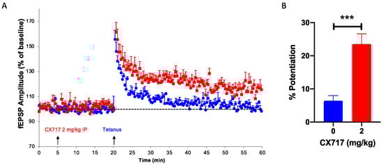 Effect of CX717 on long-term potentiation (LTP) in vivo. (A). Time-course of dentate gyrus EPSP after stimulating the perforant path. (B). Mean increases in EPSP after treatment with vehicle or 2 mg/kg CX717. Mean increases in EPSP measured over ten minutes starting ten minutes after tetanic stimulation. Bars represent the mean ± SEM from 6 animals per group. *** p < 0.001, Student’s t-test.