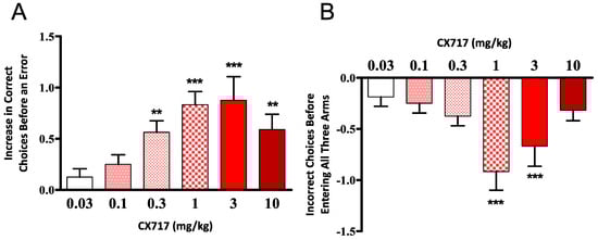 Effect of CX717 on performance in the eight–arm radial maze. Data represent mean ± SEM from 10 rats showing the number of correct choices before an error (A) and the total number of incorrect choices made before all three baited arms were visited (B). (A) One-way ANOVA p < 0.01 F (5, 54) = 4.48. (B) One-Way ANOVA p < 0.01, F (5, 54) = 4.64. ** p < 0.01, *** p < 0.001, two-tail, Wilcoxon signed-rank test.