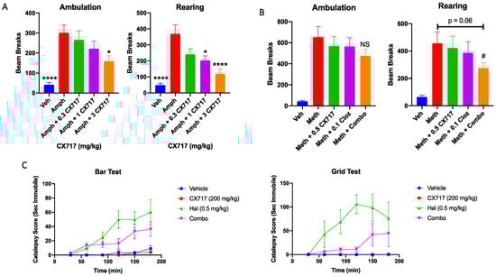 Locomotor and catalepsy studies. (A) CX717 dose-dependently reduces amphetamine-induced locomotor activity (LMA) in rats. Each data point represents the mean ± SEM from 8 to 12 rats. Statistical differences were determined using a one-way ANOVA followed by Bonferroni’s multiple comparison test versus amphetamine alone; * p < 0.05. **** p < 0.0001. (B) Effects of CX717 and clozapine on methamphetamine-induced locomotor activity. Each data point represents the mean ± SEM from 10 rats. # p < 0.05, King’s synergy test. (C) Effects of CX717 on haloperidol-induced catalepsy in bar and grid tests. Graphs depict ± SEM from 6 rats per group.
