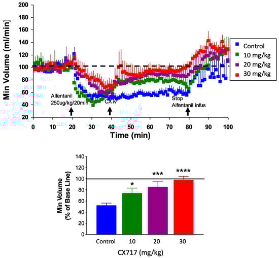 To confirm and expand upon prior work, we tested CX717 for its ability to counteract alfentanil-induced respiratory depression in rats. Potency and onset of CX717 was examined as described previously [,,,]. Alfentanil depressed breathing by about 50% (Figure 7). IV administration of CX717 dose-dependently reversed alfentanil-induced respiratory depression (p < 0.0001, F (3, 36) = 11.63, one-way ANOVA). Moreover, 10 mg/kg CX717 reduced respiratory depression to 74 ± 9.2% of control. Additionally, 20 mg/kg CX717 reduced respiratory depression to 85 ± 10% of control, and at 30 mg/kg, CX717 reversed respiratory depression to control levels (Figure 7).
