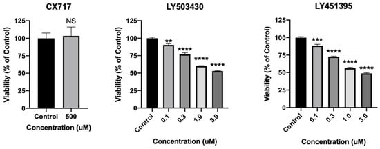 We have described cortical neuronal isolation previously []. Briefly, cortices and hippocampi were removed from E15-E17 Wistar rats. The tissue was manually cut into smaller pieces and incubated for 8–10 min with papain in calcium- and magnesium-free HBSS at 37 °C. After this incubation, HBSS was replaced with DMEM + 10% serum. The tissue was further dissociated by passaging it through a pipette after adding DNAse. The resultant suspension of cells was centrifuged through a 5% BSA (bovine serum albumin) solution and the pellet was again re-suspended in DMEM + 10% serum. Neurons were counted and seeded in a 96-well plate coated with poly-D/L-lysine. Following incubation overnight, cultures were treated for 24 h with 500 μM CX717 or increasing concentrations of LY503430 [,,,,] or LY451395 [,,,,,,]. After treatment, XTT assay was performed according to standard protocols. Briefly, phenazine methosulfate electron coupling reagent was mixed with XTT solution. Then, 25 μL of the solution was added to each well, and the plates were incubated for a further 2 h, after which absorbance was measured at 450 nm (reference 650 nm). Data were normalized to control values.