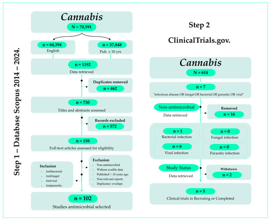 After identifying the relevant literature, a systematic search was conducted using the terms “Cannabis” OR “Cannabinoids” combined with keywords such as “antimicrobial” “antibacterial,” “antifungal,” “antiparasitic or anthelmintic,” “antiviral,” “infectious diseases” and “multidrug-resistant” with the appropriate Boolean operators (AND, OR, NOT) resulted in 1192 records.