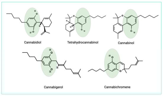 The antimicrobial properties can be owed to the phenolic structure of cannabinoids [24]. The chemical structures of the main cannabinoids are shown in Figure 2.