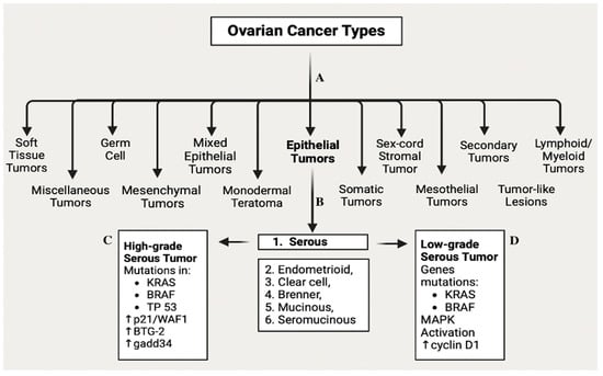 The major types of OCs. The figure represents (A) 12 types of OCs, (B) 6 main types of epithelial tumors based on the cell morphology of the tumor, which are the most common types of OCs, and 2 types of the serous type of epithelial tumors, which are (C) high-grade, and (D) low-grade.