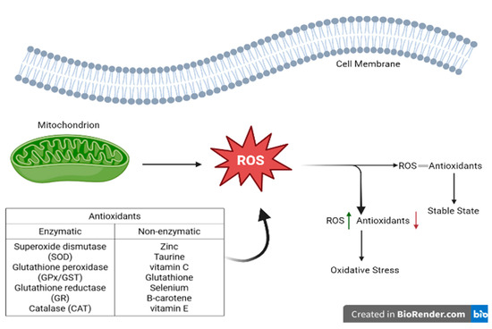 Representation of enzymatic and non-enzymatic antioxidants and balance between ROS and antioxidants. Created with BioRender.com (accessed on 26 June 2024.).