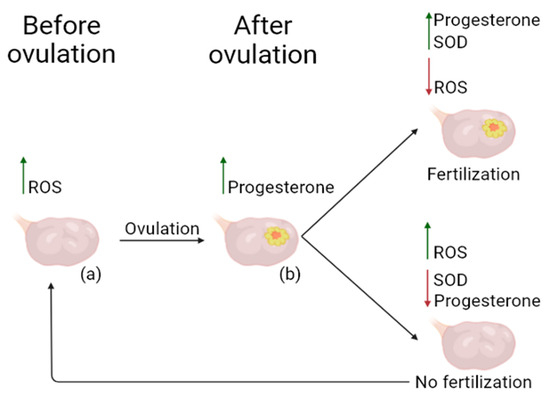 In the ovary, ROS play a crucial role in regulating the ovarian cycle, which includes processes such as meiosis and ovulation, as well as influencing the corpus luteum and related hormone production. During meiosis, the interplay between ROS and antioxidants directly impacts the entire process: during meiosis I, the balance shifts towards ROS, while during meiosis II, antioxidants become predominant [56]. Ovulation, akin to an inflammatory process, involves the production of ROS similar to inflammatory cells like neutrophils and macrophages [57]. Prior to ovulation, luteinizing hormone induces an environment with heightened ROS levels, triggering processes that facilitate ovulation (Figure 3) [57]. Following ovulation, the corpus luteum forms in the ovary, producing progesterone. In the event of fertilization, progesterone supports pregnancy; without fertilization, the corpus luteum regresses, reducing progesterone levels in preparation for the next ovulation cycle. Maintaining a balance between ROS and SOD is critical in regulating progesterone levels. SOD aids in neutralizing ROS, thereby sustaining the corpus luteum and ensuring adequate progesterone levels (Figure 3) [58]. Conversely, when regression of the corpus luteum and reduction in progesterone levels are required, SOD activity decreases and ROS levels increase, leading to corpus luteum regression (Figure 3) [59]. This regression involves a gradual decline in function followed by a complete disappearance from the ovary [60].