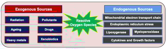 OS is a condition where the balance between reactive metabolites, the antioxidant defense system, and free radicals is disrupted. This imbalance leads to damage to molecules, thereby impairing tissue or organismal functions [67]. An imbalance in the levels of ROS and reactive nitrogen species (RNS) can disrupt normal bodily functions. Excessive amounts of these components can overwhelm antioxidant defenses, resulting in oxidative damage to lipids, proteins, nucleic acids, and other cellular structures [68,69]. ROS are primarily generated in mitochondria during cellular respiration (endogenous sources) or through the damage of cellular macromolecules (exogenous sources) (Figure 4). Environmental factors such as heavy metals, pollutants, ionizing radiation, UV light, and chemotherapeutics can also lead to the formation of ROS, thereby altering cellular functions [70,71].