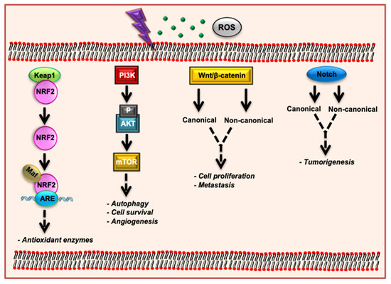 OS is characterized by the excessive generation of ROS and/or a reduction in antioxidant defenses during cellular metabolism. OS has been found to play a role in the pathophysiology of many human malignancies. ROS-mediated cellular pathways promote cell survival, oncogenesis, and metastasis and render cancer cells resistant to treatment (Figure 5) [91].