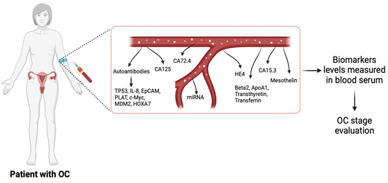 Representation of biomarkers that can be found in increased amounts in blood serum in patients with OC. CA125 (Cancer antigen 125) is currently the most used and most common biomarker for OC diagnosis and monitoring; however, there are novel biomarkers that are used, alone or in combination with CA125, for the detection and evaluation of OC, such as HE4 (Human epididymis protein 4), CA15.3 (Cancer antigen 15-3), CA72.4 (Cancer antigen 72-4), mesothelin, miRNAs, as well as autoantibodies against IL-8 (Interleukin 8), EpCAM (Epithelial cell adhesion molecule), PLAT (Tissue type plasminogen activator), c-Myc (Cellular myelocytomatosis oncogene), MDM2 (Mouse double minute 2 homolog), and HOXA7 (Homeobox A7). Created with BioRender.com (accessed on 26 June 2024.).