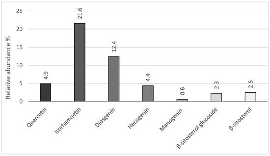 Figure 2 illustrates the relative abundance (%) of the tentative major compounds identified in the BagEE using HPLC-MS. The analysis revealed that isorhamnetin was the predominant compound, accounting for 21.6% of the total composition, followed by diosgenin at 12.4% and quercetin at 4.9%. These results highlight the presence of bioactive flavonoids, saponins, and phytosterols as key components of the BagEE, demonstrating its potential as a source of valuable bioactive molecules.
