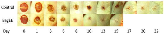 Photographs show the progression of wound closure over a 22-day period. Control group without treatment (water); BagEE: ethanolic extract of agave bagasse (n = 8 in each group).