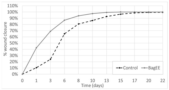 Dynamic evolution of wound closure. Temporal evolution of the wound area. Control group without treatment (water); BagEE: ethanolic extract of agave bagasse.