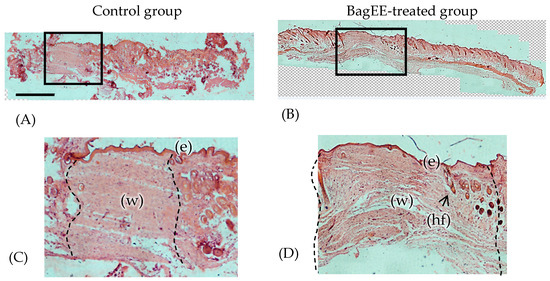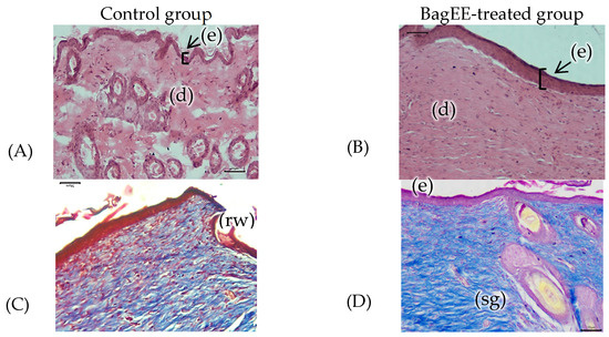 In Figure 5B, corresponding to the BagEE-treated group, the early presence of granulation tissue, rapid re-epithelialization, and a well-healed dermis are confirmed, as shown in Figure 5D. These images show that wounds treated with BagEE exhibited enhanced granulation tissue formation, characterized by significant fibroblast proliferation and coverage by a thick, regenerated epithelial layer. In this group, the increased thickness of the epithelium suggests that the re-epithelialization process is further along, reflecting the active migration and proliferation of epithelial cells to efficiently cover the wound. This observation indicates that wound closure occurred more quickly in the BagEE-treated group than in the control group, as shown in Figure 5A,C. In the control group, a thinner epithelium is observed, suggesting that the healing process is still incomplete [31].