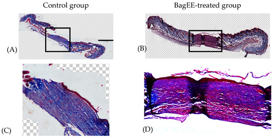 Histomorphological evaluation of the wound collagen matrix architecture, shown in Figure 7, was conducted using Masson’s trichrome staining, which highlights total collagen fiber content in blue. The BagEE-treated group, as shown in Figure 7B,D, displayed a more organized collagen matrix with thicker collagen fibers, while the control group exhibited thinner, coarser fibers throughout the wound area, indicative of an earlier phase of epithelialization, as shown in Figure 7A,C.