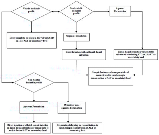 For screening a leachable study, drug product samples and standards (internal or external) are prepared at a concentration of the AET level or below the AET level, considering the uncertainty factor of the analytical method. To diminish peaks from the drug product formulation matrix and to identify leachables that leach out of the packaging system, delivery system, and manufacturing process equipment, a lab-prepared control drug product sample (without contact with manufacturing polymeric parts like the tubing and filter and filled using a method other than that used in the final packaging system) is prepared and analyzed in the same sequence. A leachable sample can be prepared with a similar procedure that was adopted during the method’s verification for generic solvent media. There are the following recommendations for sample preparation for volatile, semi-volatile, and non-volatile organic compounds (Figure 3).