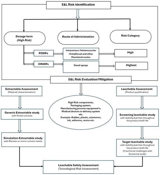 Schematic diagram of risk identification/evaluation and mitigation for extractable and leachable compounds for pharmaceutical drug products.