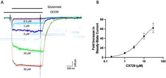 CX729, a high-impact ampakine, did not induce any whole-cell current in the absence of applied glutamate, but it dramatically increased steady-state inward currents induced by 1 s applications of 500 μM glutamate. (A) Experimental traces show the effects of CX729 at different concentrations; (B) fold increase in steady-state current. The EC50 value is 7.4 µM, and the Hill coefficient is 1.027. Values are the mean ± SEM of 7 replicates.
