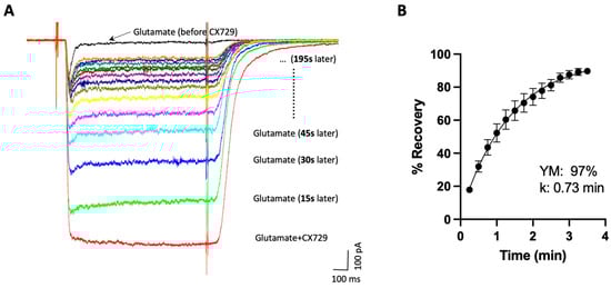Recoveries from the enhancement by CX729 were slow. (A) Glutamate was applied every 15 s after co-application of CX729 and glutamate. After 3 min, the glutamate-induced current was still greater than that induced before CX729 exposure; (B) time-dependent recovery from the potentiation. The time constant was 0.73 min. Values are the mean ± SEM of 6 replicates.