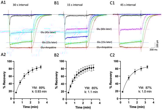 The recovery time was not different if saline was substituted for glutamate during the recovery period. (A1,A2) Glutamate was applied every 30 s; (B1,B2) glutamate was applied every 15 s; (C1,C2) glutamate was applied every 45 s. Saline was substituted/applied between the applications of glutamate. Values are the mean ± SEM of 4–5 replicates.