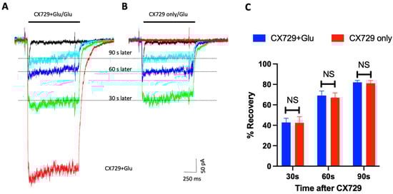 The slow recovery does not require the simultaneous presence of glutamate and CX729. There was no difference between glutamate-induced responses after transient applications of CX729 or CX729 plus glutamate. (A) Glutamate was applied simultaneously with CX729; (B) CX729 application alone did not induce inward currents. For (A,B), subsequent test currents were evoked by the application of glutamate 30, 60, or 90 s after CX729 or CX729 plus glutamate application. (C). Recovery of steady-state current. Average data from 5 cells. Two-way ANOVA, effect of time F (2, 12) = 232.1, p < 0.0001. Effect of time F (1, 6) = 0.03932, p = 0.8494. effect of time × treatment F (2, 12) = 0.1225, p = 0.8858. NS, not significant, p > 0.9, Bonferroni’s multiple comparison test. Bars are the mean ± SEM of 4 replicates.