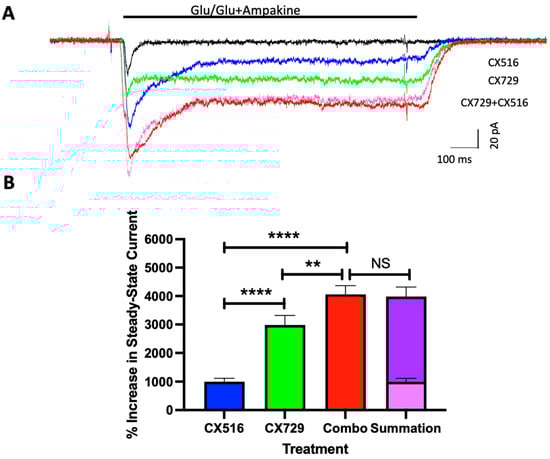 (A) Effects of 6 mM CX516 on AMPA receptor responses (blue), 3 μM CX729 (green), and finally CX729 plus CX516 (red) were measured. The purple line shows the summary of blue and green lines; (B) mean values from 7 individual cells. ANOVA F (3, 18) = 60.76, NS, not significant, p < 0.0001. ** p < 0.01, **** p < 0.0001, Bonferroni’s multiple comparison test. Values are the mean ± SEM of 7 replicates.
