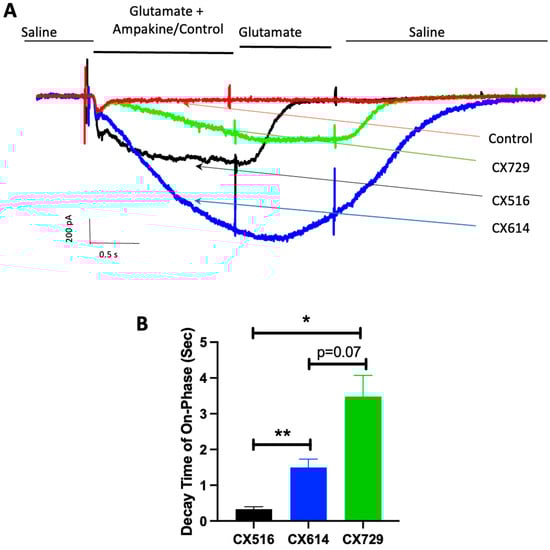 In addition to investigating the kinetics of AMPAR recovery from potentiation by an ampakine, we also sought to interrogate the on rate of several ampakines in cortical neurons. When ampakines are co-applied with glutamate, CX729, CX614, and CX516 exhibit disparate on rates. CX516 reaches steady-state currents within one second of application (Figure 7A,B). For the high-impact ampakines, one-second co-application of each ampakine with glutamate was too short to measure their constants. However, the estimated decay times of on rates indicate that CX729 had a slower time constant than what was observed for CX614 (Figure 7A,B). Further, termination of CX516 application resulted in diminution back to baseline within 0.8 s (Figure 7A). In the case of CX614 and CX729, cessation of ampakine application resulted in a slower reduction of current. For CX729, it was only after stopping glutamate application that inward currents returned to baseline, correlating with slow recovery from potentiation. After stopping application of CX614, the current reached its peak when glutamate was applied alone, began to diminish during glutamate application, and returned to baseline upon application of saline.