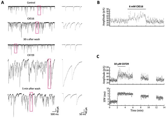 The effects of CX729 on minis were slow to recover. (A) Both of 10 μM CX729 and 6 mM CX516 increased the amplitude and half-width (HW) of minis. It took seconds for the effects of CX516 to diminish back to baseline (B). Meanwhile, it took more than 8 min to appreciate diminution of CX729’s effects (C).