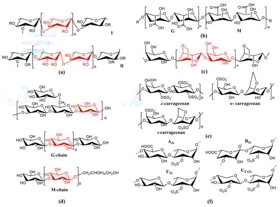 The common structural formulas of algal polysaccharides. (a) Structures of different backbones of fucoidans; (b) structure of alginate; (c) structure of agarose; (d) structure of laminarin; (e) structure of the main repeating disaccharides found in ulvan, ulvanobiuronic acids A3S and B3S, and ulvanobioses U3S and U2′S, 3S; (f) structure of three typical carrageenens, including λ-carrageenan, κ-carrageenan, and ι-carrageenan.