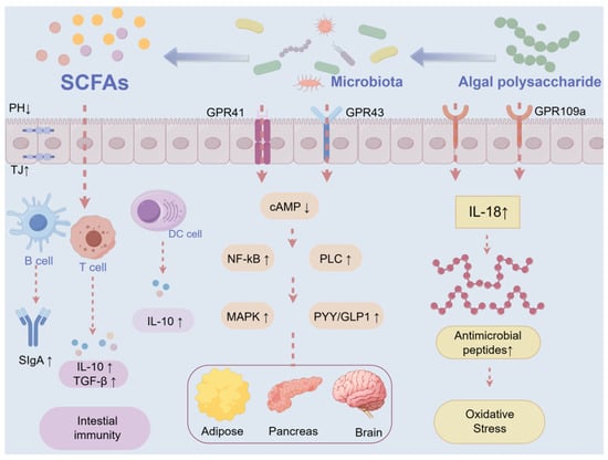 Some polysaccharides found in seaweeds are low-fermentable sugars [77], which can be fermented by intestinal probiotics, altering the composition of the gut microbiota and producing beneficial metabolic byproducts that promote gut health, indicating their potential as prebiotics [24,78,79]. Algal polysaccharides function as prebiotics, reducing the intestinal pH [80], inhibiting the growth of pathogens [81], and increasing the expression of tight junction proteins [82]. The secretion of anti-inflammatory cytokines and antibodies from monocytes cells (DCs), T cells, and B cells is stimulated, thereby enhancing intestinal immunity (Figure 3) [24,83]. Furthermore, short-chain fatty acids (SCFAs) critically maintain gut homeostasis through their ligand–receptor interactions with intestinal epithelial cells, primarily via the activation of GPR41 and GPR43, two key G protein-coupled receptors involved in microbial–host crosstalk. These receptors play crucial roles in managing blood glucose levels, lipid profiles, obesity, and insulin signaling pathways [84,85,86]. Fucoidan is extracted from Pearsonothuria graeffei, and its identified structure strongly eliminates gut microbiota dysbiosis and metabolic disorders in high-fat diet (HFD) murine models [87].