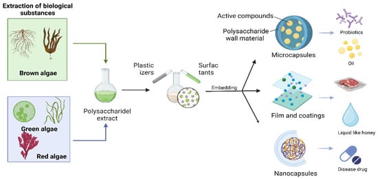 Algal polysaccharides have excellent emulsifying and gelling properties [125], as well as film-forming properties [126]; hence, they are essential wall materials for microcapsules (Figure 4). The encapsulation of substances in algal polysaccharide capsules increases their ability to resist various environmental factors and decreases the toxic side effects of the preparation without reducing its efficacy [127].