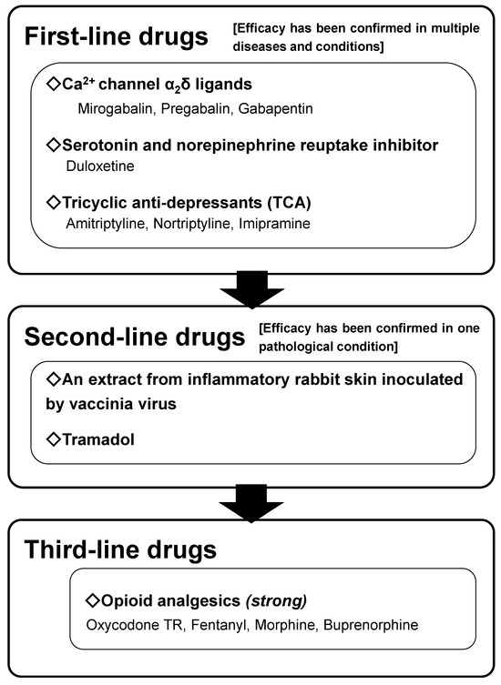 Among the treatments for neuropathic pain, pharmacotherapy is the most confirmed evidence-based treatment strategy. In several developed countries including Japan, several lines of pharmacotherapy guidelines for neuropathic pain have been suggested, including gabapentinoids, anti-depressants and opioid analgesics [7,8] (Figure 1). Based on these guidelines and recommendations, an optimized pharmacotherapeutic treatment strategy for neuropathic pain is expected to improve treatment outcomes. Non-steroidal anti-inflammatory drugs (NSAIDs) and acetaminophen, which do not indicate any effective evidence of neuropathic pain and hence are not recommended in any treatment guidelines for neuropathic pain, have still been mainly prescribed in primary care practices [9]. Neuronal inflammation seems to hardly contribute to the development and maintenance of neuropathic pain, and therefore NSAIDs are ineffective. Although the definite analgesic mechanism(s) of acetaminophen does not still be delineated, there is not any evidence that acetaminophen can modulate VGCC and suppress pain transmission. Opioid analgesics consistently demonstrate a practical usefulness in treating neuropathic pain; however, in some cases, the long-term use of opioid analgesics is practically required. Long-term use of opioid analgesics might contribute to developing metal dependence, with an excessive increase in opioid doses. Therefore, opioid analgesics are usually positioned as the third (or even the forth)-line drug in neuropathic pain pharmacotherapy guidelines [7,8].