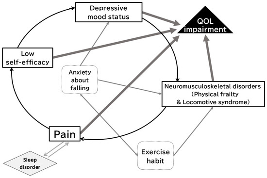 Focusing on the rapidly growing super-aged society worldwide, the prevalence of neuropathic pain is over 25% in patients with the locomotive syndrome [10]. Moreover, neuropathic pain conditions of neuromusculoskeletal disorders are regarded as one of the inhibitory factors of gait stability in the elderly [10,11]. Because a super-aged society is growing in Japan before the rest of the world, lessons from Japanese clinical situations surrounding neuropathic pain as a healthcare burden would be valuable for the prevention and improvement of physical frailty and the locomotive syndrome in the middle-aged and elderly population [5,6]. Furthermore, neuromusculoskeletal disorders, including physical frailty, the locomotive syndrome, neuromusculoskeletal pain, and the accompanying psychological distress known as decreased self-efficacy (self-confidence in one’s own body), can lead to decreased motivation and a depressed mood for exercise habits and maintaining ADL. Decreased self-efficacy caused maladaptive effects on outcomes with pharmacotherapy in neuropathic pain patients [12]. Psychological and psychiatric conditions such as depression, anxiety, sleep disorder and chronic pain including neuropathic pain are highly comorbid [13], and such conditions are significantly associated with pronounced changes in behavior, decreased activity, social withdrawal and avoiding behavior [14]. Further, sleep disorders, which are psychological and psychiatric conditions, and pain impair reciprocally, as shown in longitudinal studies [15]. These can result in excessive and unnecessary resting and actualized avoidance behaviors for exercise habits and ADL to avoid inducing and/or exaggerating the pain. Consequently, disuse associated with neuromusculoskeletal disorders and pain worsen. Thus, a vicious loop is established in patients with neuromusculoskeletal disorders and pain, resulting in a decline in HRQOL (Figure 2) [16].