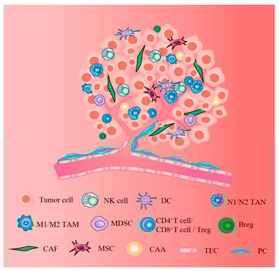 Stromal cells, including CAFs, MSCs, CAAs, TECs, and PCs, establish complex signaling networks that regulate tumor development, growth, and resistance to treatment. The figure is reprinted from Zhao et al. 2023 with free reuse permission [60].