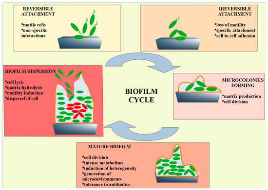 Biofilm formation is a rapid process that involves an initial reversible attachment of bacteria to abiotic or biotic surfaces through non-specific interactions, followed by irreversible attachment promoted by covalent interactions and hydrogen bonding [17]. During these attachment phases, an initial shift in gene expression enables irreversible attachment, while subsequent changes in gene expression and cellular phenotype enable extracellular matrix production, biofilm maturation, and finally, at the end of development, biofilm dispersion [18] (Figure 1).