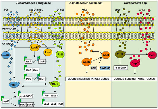 QS is a sophisticated regulatory system that enables bacteria to communicate either within the same species or between different species in a shared community. The communication process is based on the production, secretion, recognition, and response to extracellular signaling molecules called autoinducers (AI) [68]. When the concentration of signalling molecules exceeds a critical threshold, bacteria recognize these signals, leading to changes in the expression of target genes involved in numerous processes. Functionally, these processes can be divided into four categories: (i) maintenance and proliferation of the bacterial population—production of exoenzymes, sporulation, siderophore synthesis, acid resistance; (ii) behavioral responses—biofilm formation, maturation and dispersal, adhesion, motility; (iii) horizontal gene transfer—competence development, plasmid conjugation; (iv) interactions with other microorganisms and the host—production of virulence factors and EPSs, antibiotic synthesis, bioluminescence and factors involved in host colonization [69]. Gram-negative bacteria utilize two main types of QS systems. Type 1 QS is predominantly used for intra-species signaling and is based on AHLs classified as autoinducers-1 (AI-1). These AHL molecules interact with their specific receptor, the transcriptional regulator LuxR, to influence the expression of target genes. Type 2 QS facilitates both intraspecies and interspecies communication and utilizes cyclic furanone compounds known as autoinducers-2 (AI-2). The enzyme LuxS plays a central role in the synthesis of AI-2 molecules [70]. This review provides a detailed overview of the QS network in Gram-negative bacteria, P aeruginosa, A. baumannii, K. pneumoniae, E. coli, and Burkholderia spp. Most of these bacteria belong to the ESKAPE pathogen list (E. faecium, S. aureus, K. pneumoniae, A. baumannii, P. aeruginosa, Enterobacter spp.) and have been recognized as emerging public health threats for which effective therapies are urgently needed [71]. The elucidation of QS mechanisms in Gram-negative pathogenic bacteria can therefore contribute to the development of innovative strategies for infection control.