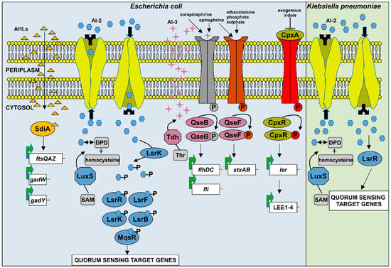 E. coli has four major QS systems: (i) the orphan SdiA regulator (LuxR homolog), (ii) the LuxS-based AI-2, (iii) the AI-3/epinephrine/norepinephrine system, and (iv) the indole-based QS system [99] (Figure 3). E. coli does not synthesize AHLs but can sense these molecules in the environment through the SdiA regulator. SdiA binds a broad spectrum of exogenous AHLs produced by other bacterial species and enables E. coli to detect the presence and density of neighboring bacteria. Upon AHL binding, SdiA modulates the expression of specific genes, leading to either activation or repression, thus facilitating interspecies communication. This ability provides E. coli with an adaptive advantage in responding to QS signals from both cooperating and competing bacteria, and allows it to adapt to complex environmental conditions [100]. The SdiA-mediated QS regulates multiple virulence-associated phenotypes, including acid and drug resistance, colonization and survival in the gastrointestinal tract, adherence, and biofilm formation [99].