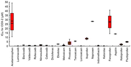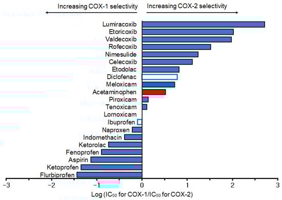 Although acetaminophen is an inhibitor selective for COX-2, its potency to inhibit COX-2 is weaker than that of diclofenac, ibuprofen, and other NSAIDs as shown by the IC50 values for COX-2 in Figure 4, which was prepared by using reported data [25,26,27,29,30,32,33]. Acetaminophen inhibits COX-2 with a mean IC50 value of 28.5 μM, which is comparable to that of naproxen and fenoprofen. Diclofenac is the most potent inhibitor of COX-2 with a mean IC50 value of 0.042 μM, followed by coxibs, oxicams, and conventional NSAIDs that show mean IC50 values ranging from 0.109 μM for ketorolac to 13.9 μM for aspirin.